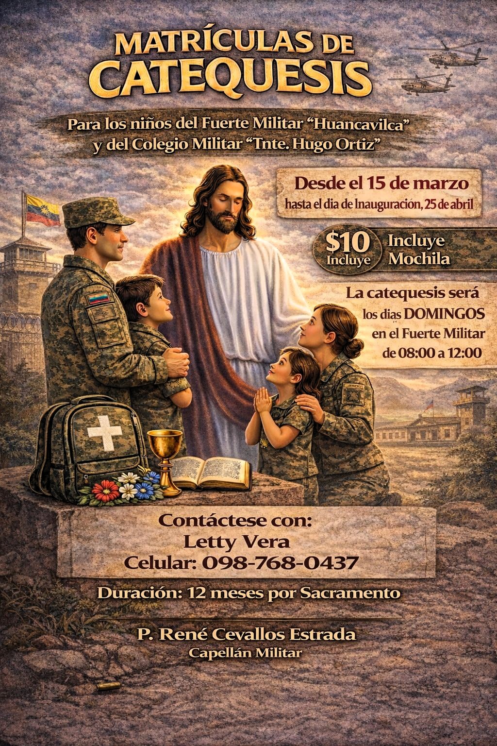 La Unidad Educativa de Fuerzas Armadas Colegio Militar Nro. 2 “Tnte. Hugo Ortiz G.” informa a los padres de familia y representantes que se encuentra abierta la convocatoria para el programa de catequesis dirigido a los niños de la comunidad del Fuerte Militar “Huancavilca” y del COMIL 2.