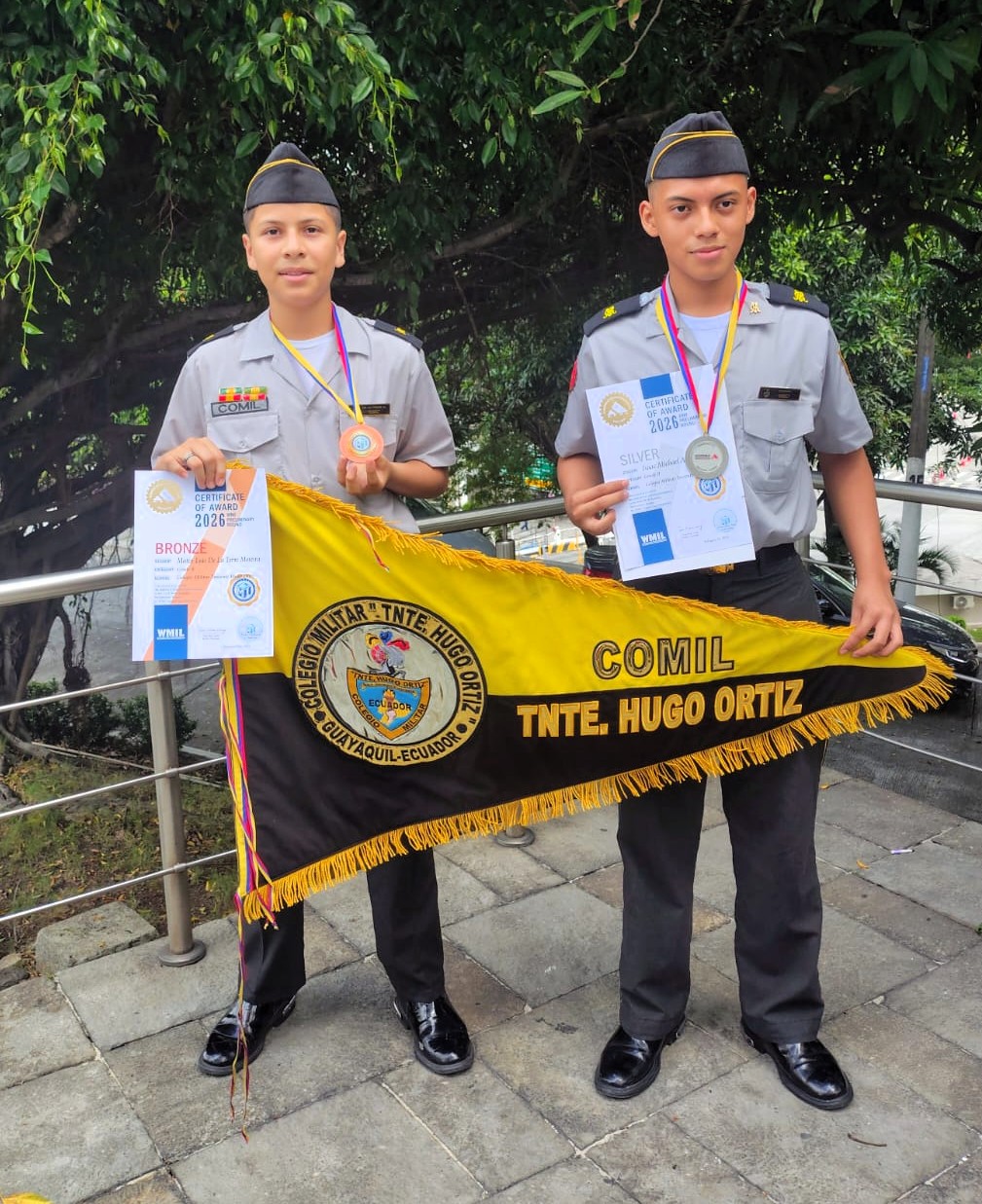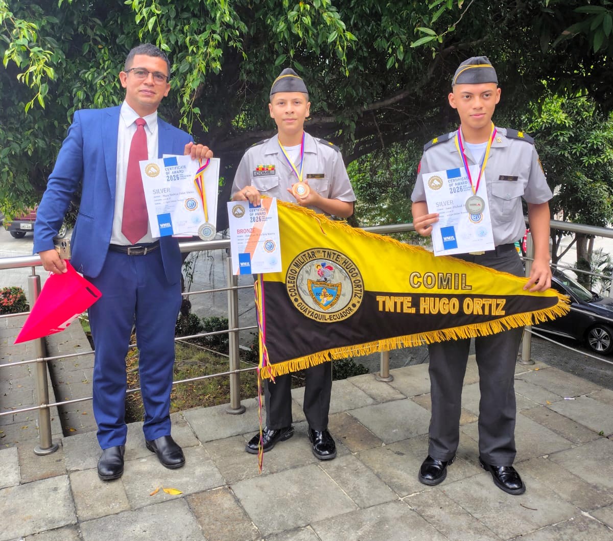 El COMIL 2 se posiciona así entre las instituciones educativas seleccionadas a nivel nacional, evidenciando la calidad de su formación académica. En esta destacada participación, el cadete Mateo Luis De La Torre Moreira, de 9no de Educación General Básica, obtuvo medalla de bronce, mientras que Isaac Michael Alvarado Alay, de 10mo de Educación General Básica, y Paula Verónica Dillon Muñoz, de 2do de Bachillerato, alcanzaron medallas de plata, consolidando un importante logro institucional.