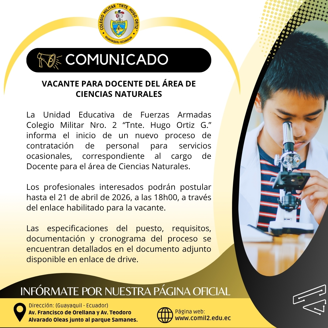 VACANTE PARA DOCENTE DE CIENCIAS NATURALES
